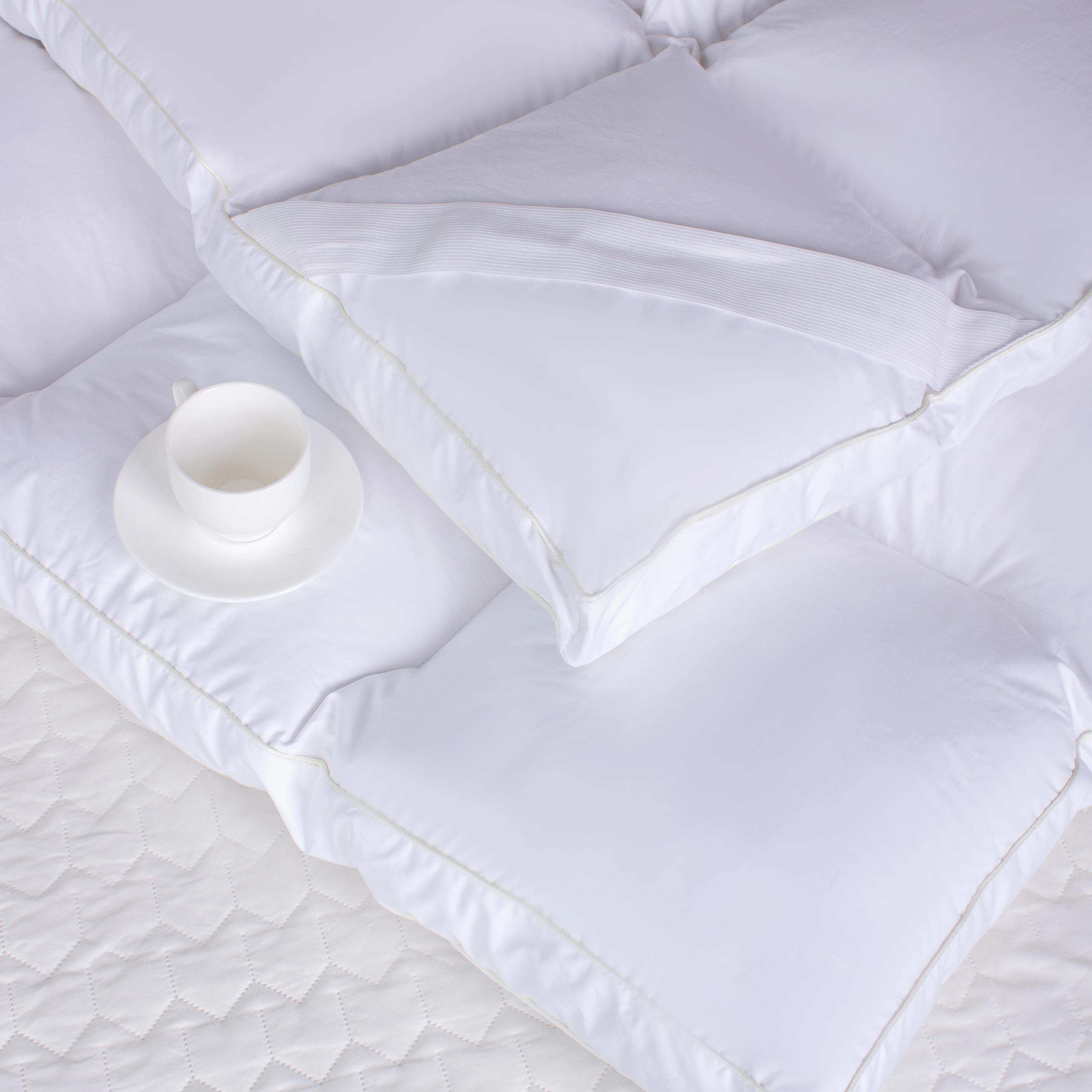 "DeLuxe White" пух - высококачественный отборный белый пух, который соответствует мировым стандартам качества. Показатели по мягкости и упругости пуха контролируются лабораторно и гарантированно находятся в пределах норм, сопоставимых с наполнителем, который используют европейские производители для производства своих пуховых изделий.