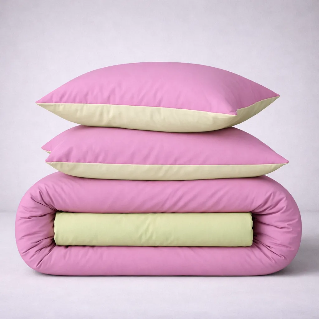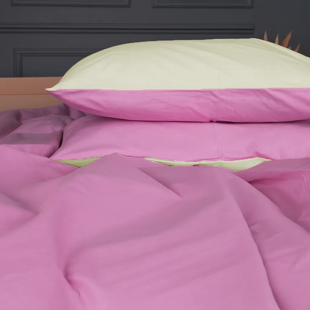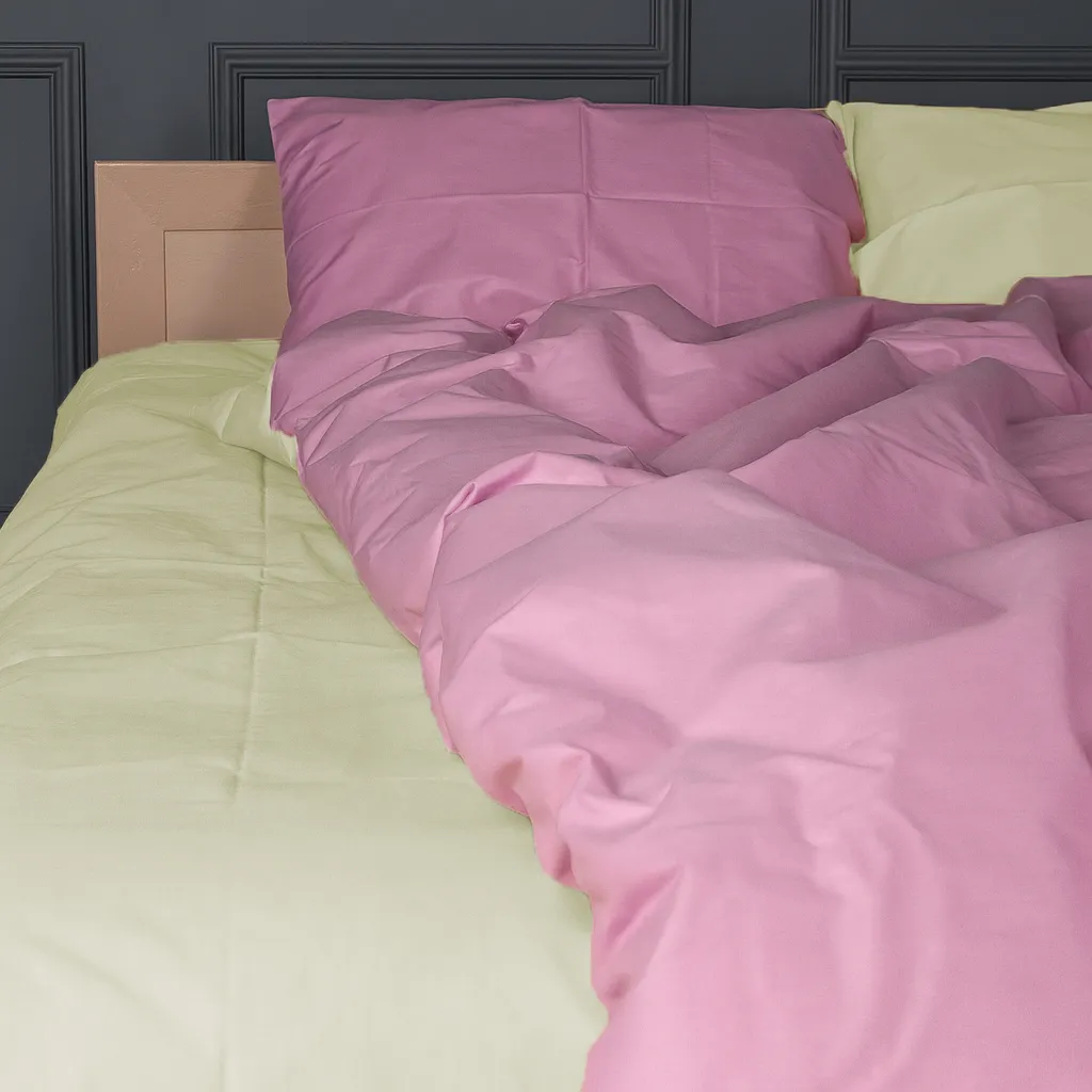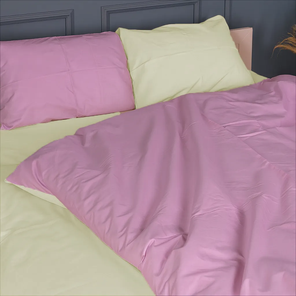 Цвет Простынь однотонная салатовая, наволочки и пододеяльник двустороние салатовый и фиолетовый