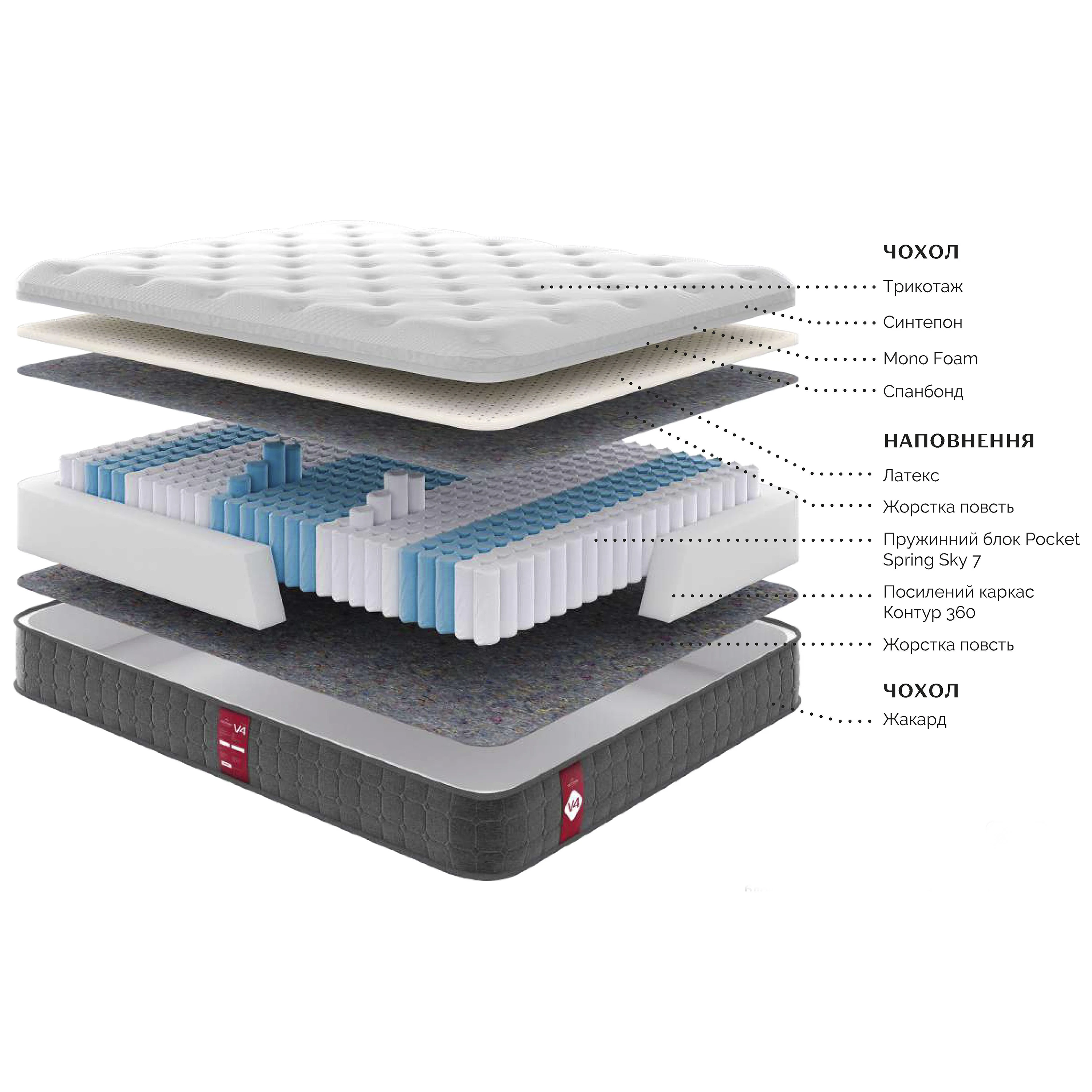 Наповнення Піна Mono Foam, пружинний блок Pocket Spring Sky 7, жорстка повсть, синтепон, спанбонд, латекс, тканина трикотажна та жакардова