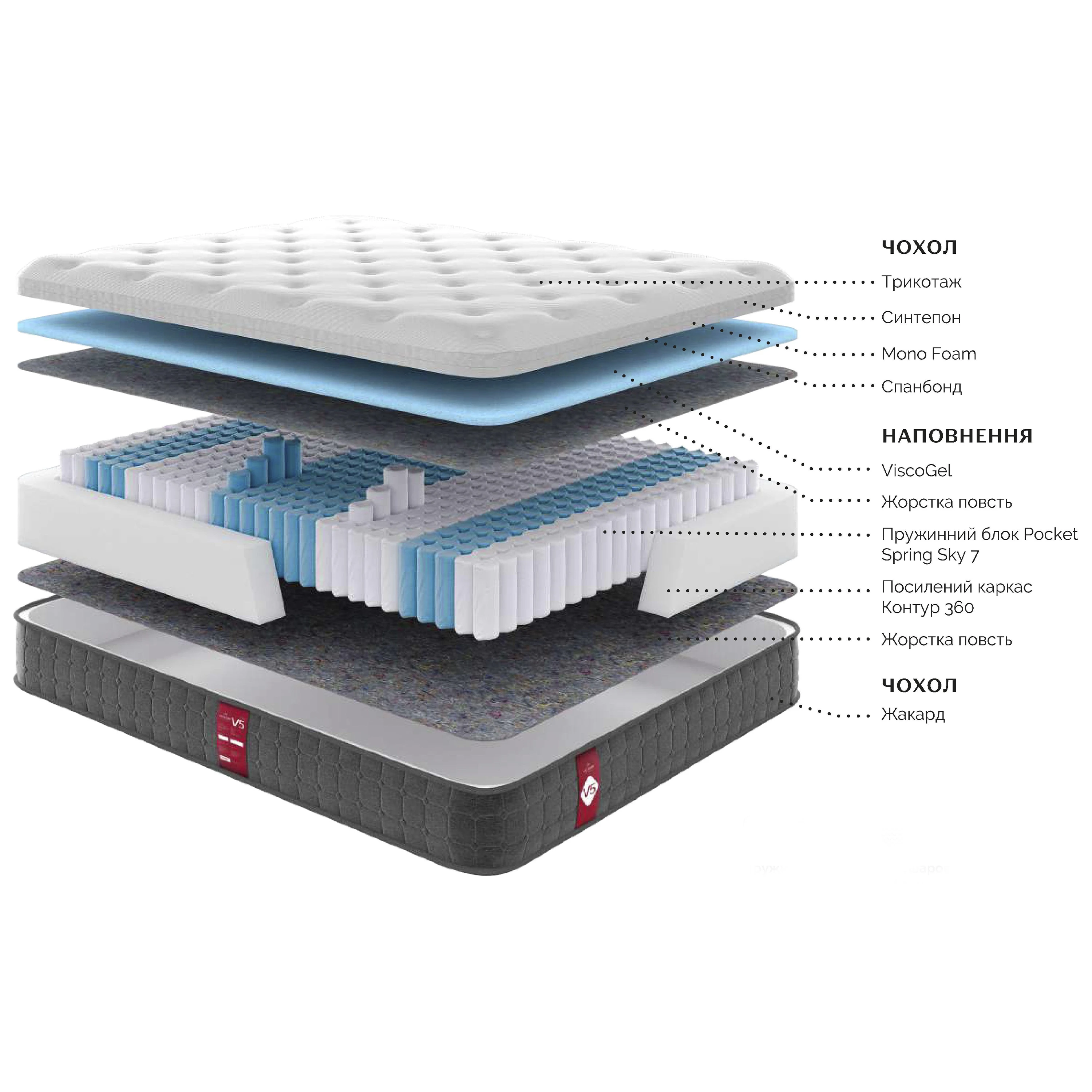 Наповнення Піна Mono Foam, пружинний блок Pocket Spring Sky 7, жорстка повсть, синтепон, спанбонд, ViscoGel, тканина трикотажна та жакардова