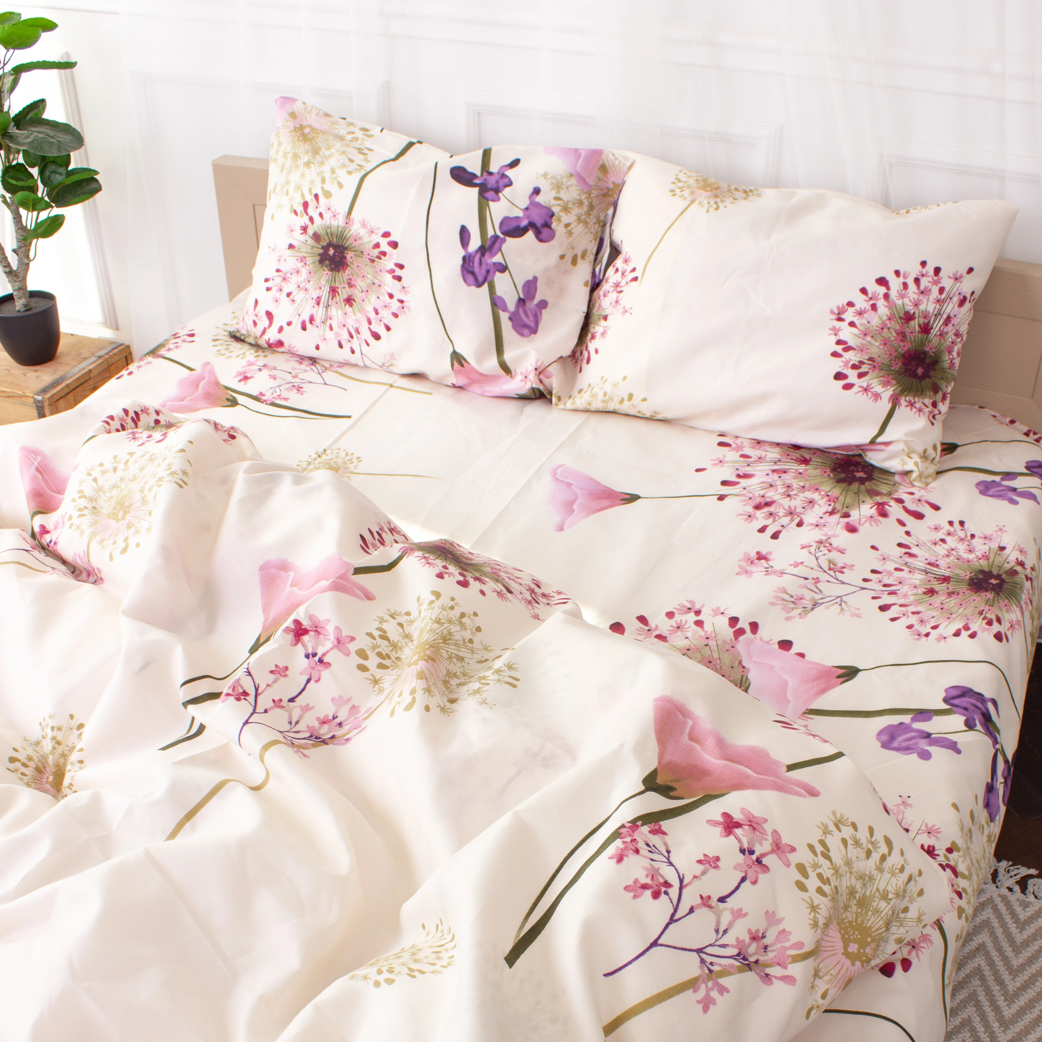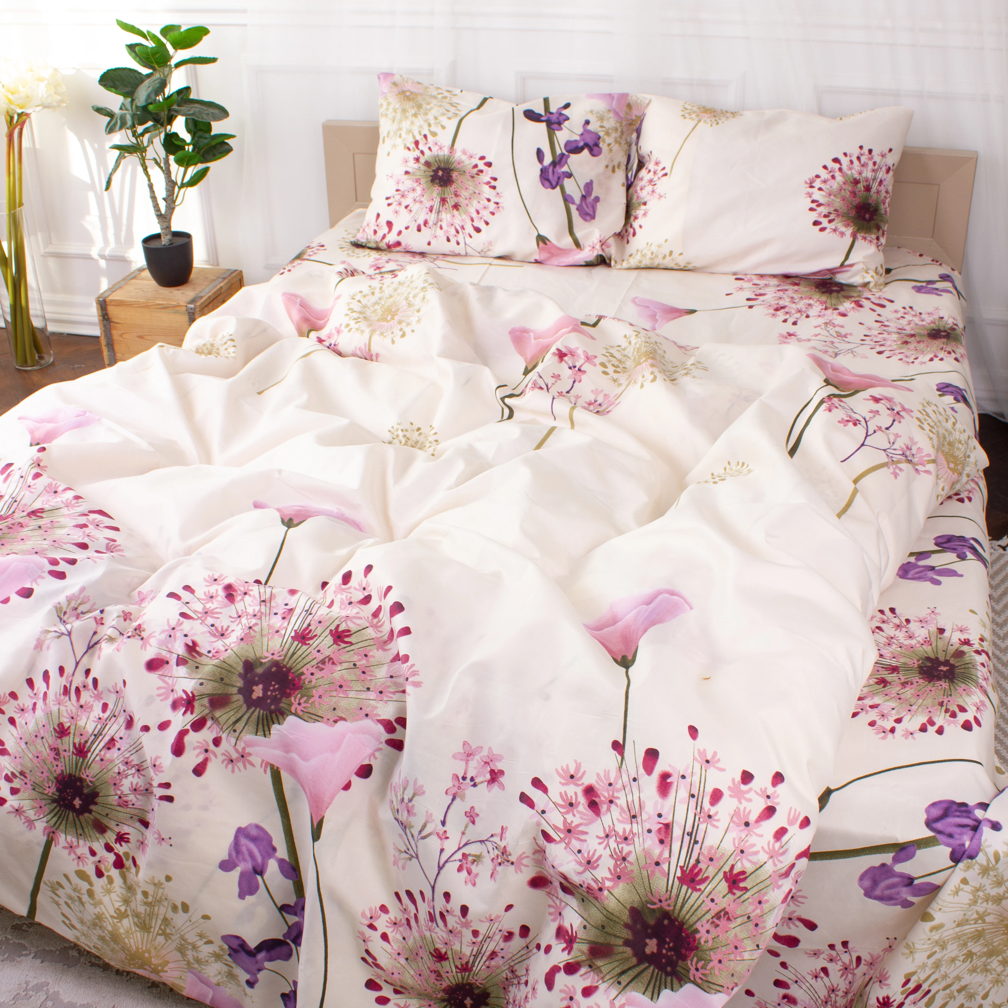 Всі наступні прання рекомендуємо проводити за температури 40 ° С делікатний режим, сушіння, прасування при 150 ° С дозволено.  Прати відповідно кольоровій гамі постільної білизни.